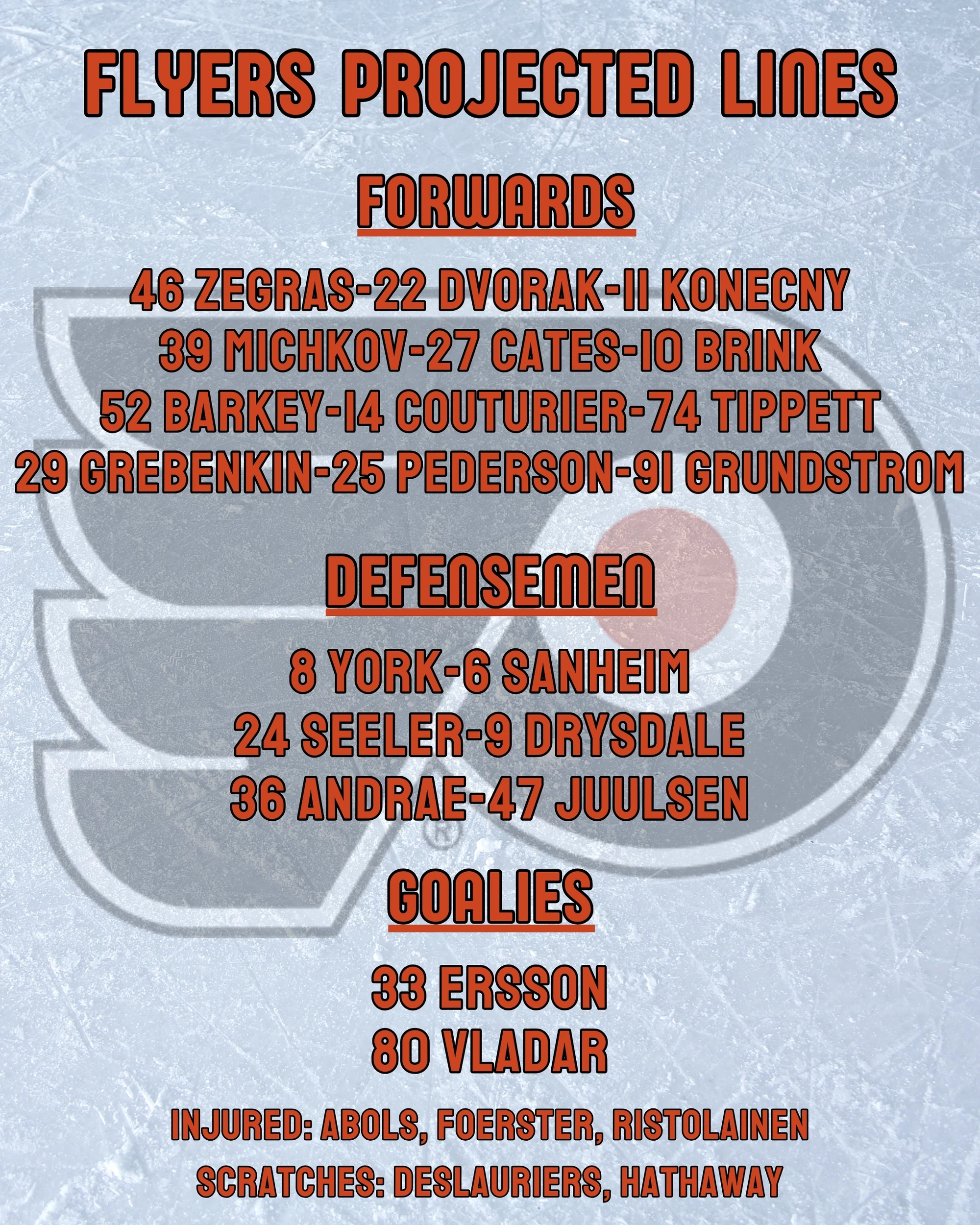 - Flyers: Konecny's status for Thursday's game will be known closer to game time. He blocked a shot off his foot late in the second period of Wednesday's game. Rasmus Ristolainen also left Wednesday's game in the first period and did not return. Emil Andrae would come back into the lineup if he's unable to play.