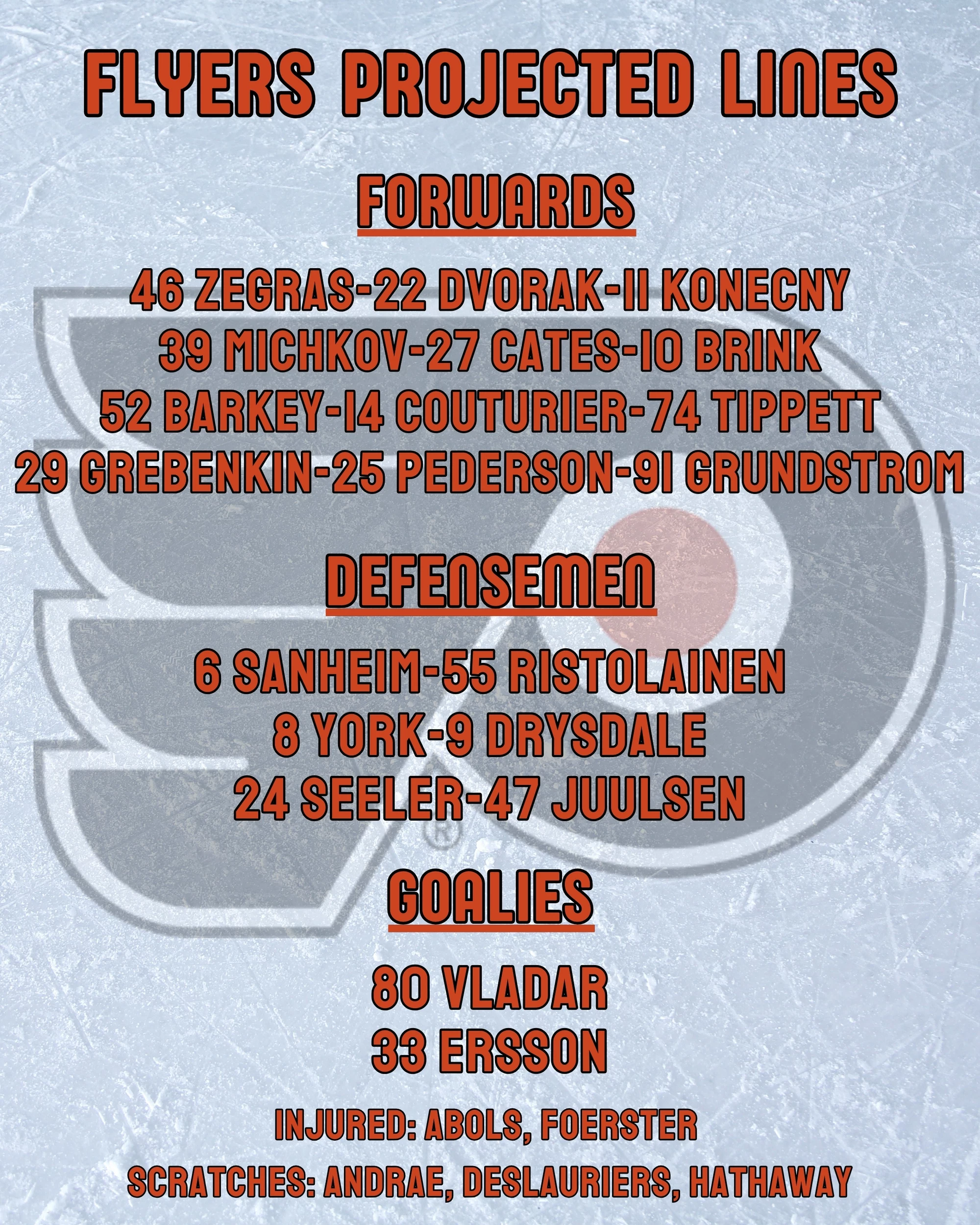 - Flyers: Noah Juulsen returns to the lineup for Emil Andrae. No other changes are expected.