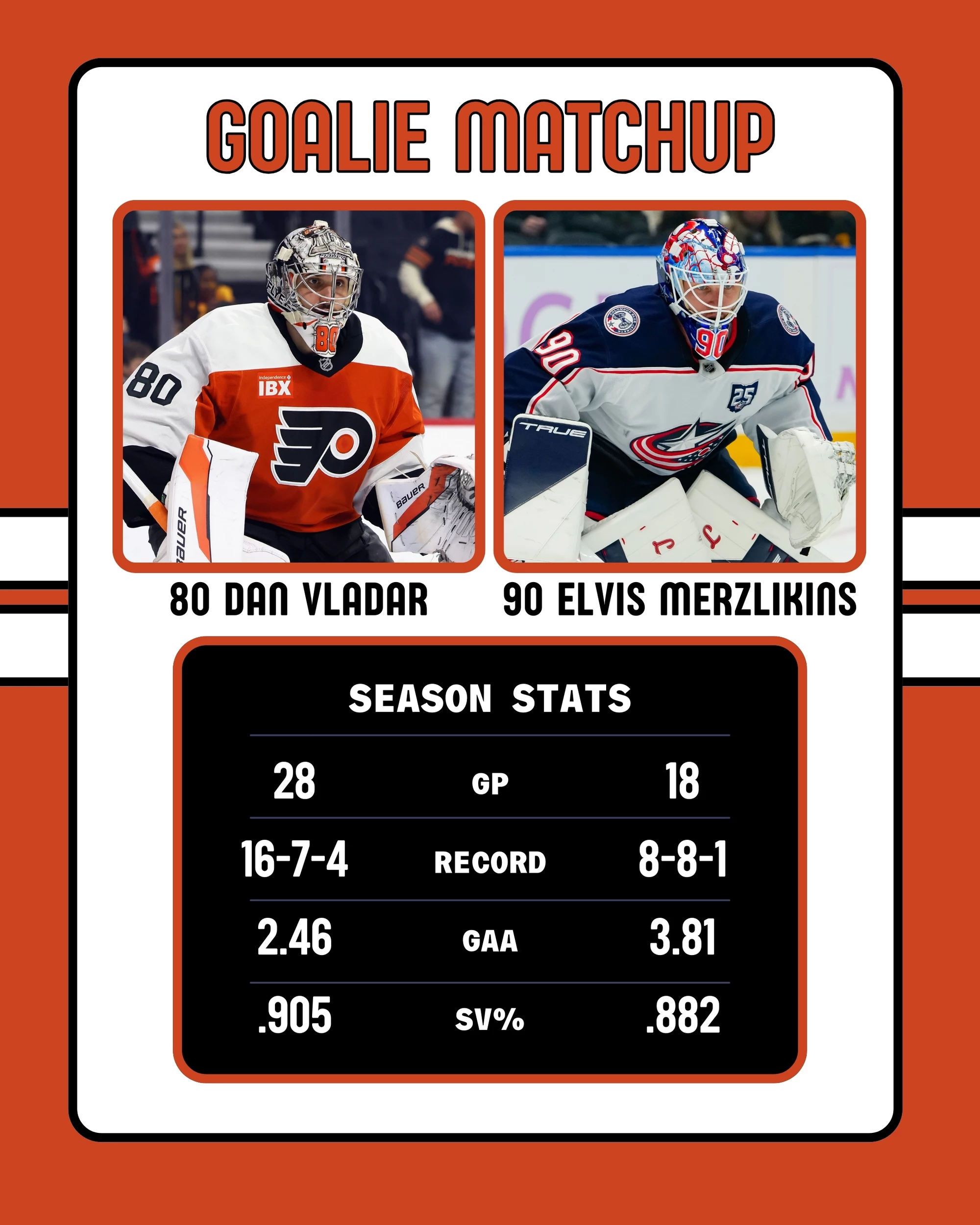 Dan Vladar gets the start for the Flyers. Vladar returns after missing the last six games due to injury. He allowed two goals on six shots against Buffalo on Jan. 14 before leaving after the first period. Vladar allowed four goals on 25 shots in a loss to Tampa Bay in his last full game on Jan. 12.