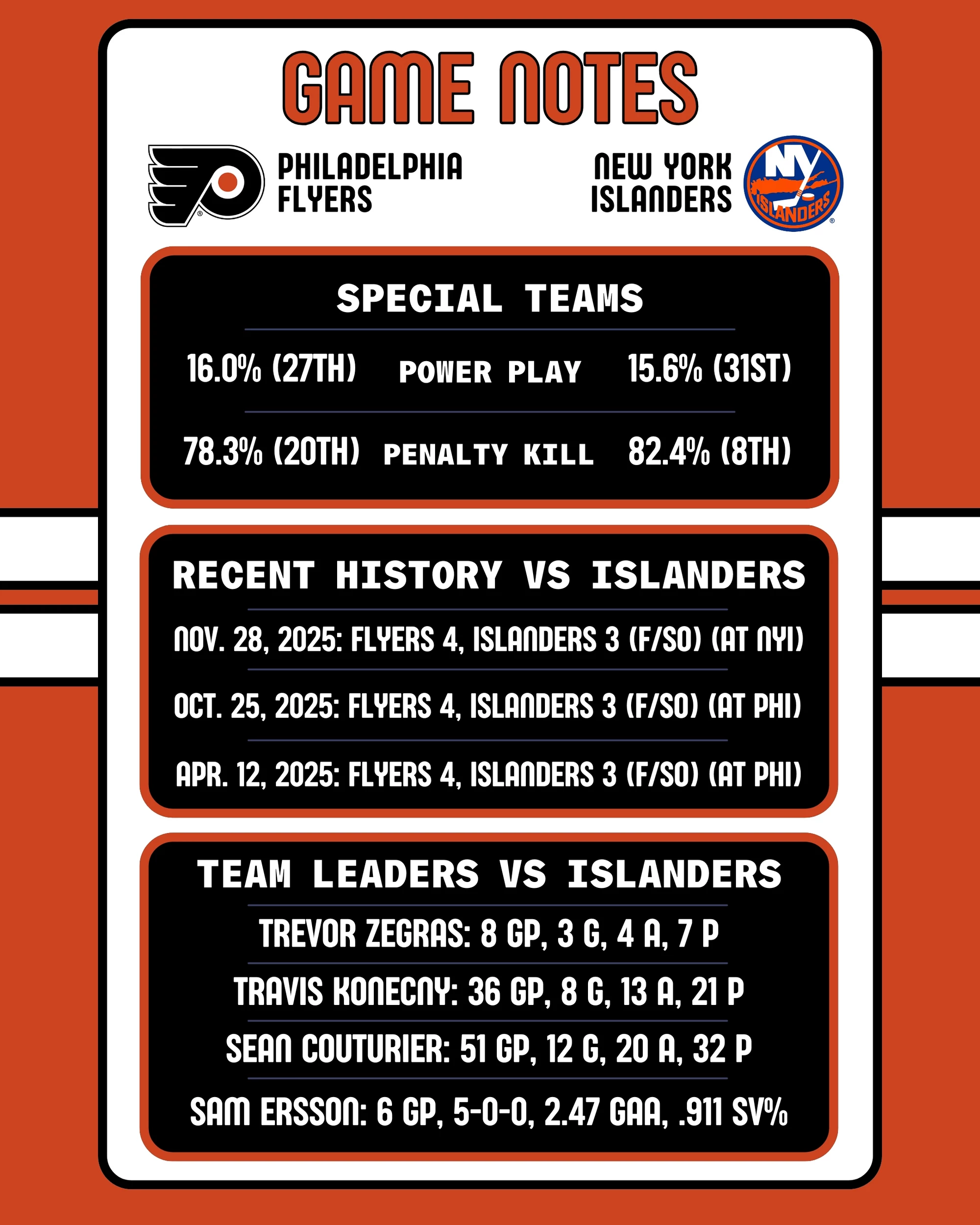 The New York Islanders come into Philadelphia having lost three of the last four games, their latest a 5-0 defeat to the Buffalo Sabres. It's not quite the magnitude of a March matchup in the final 20 games of the regular season, but there is plenty on the line with the Olympic break coming up fast.