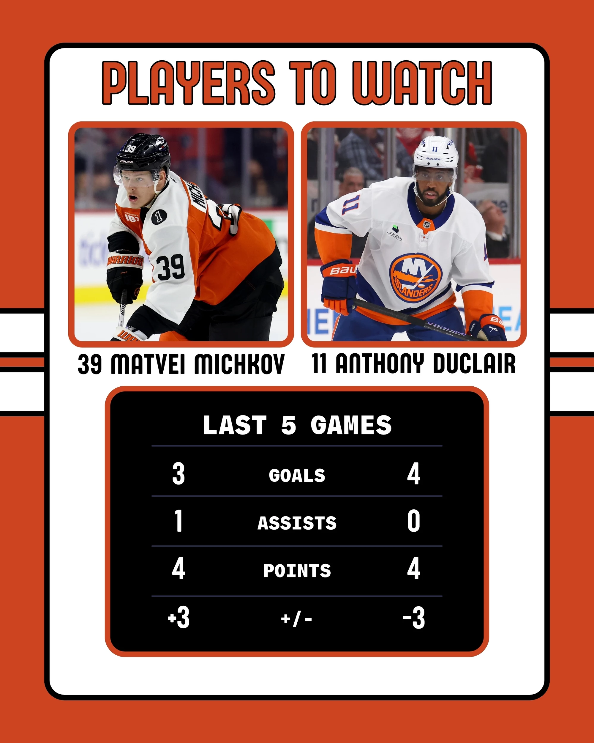 Sam Ersson gets the start for the Flyers. Ersson made 32 saves on 35 shots in a win over Colorado on Friday night, his second win of the road trip. Ersson has two wins over the Islanders this season, both via the shootout, and has a 5-0-0 record in six games against the Islanders in his career.