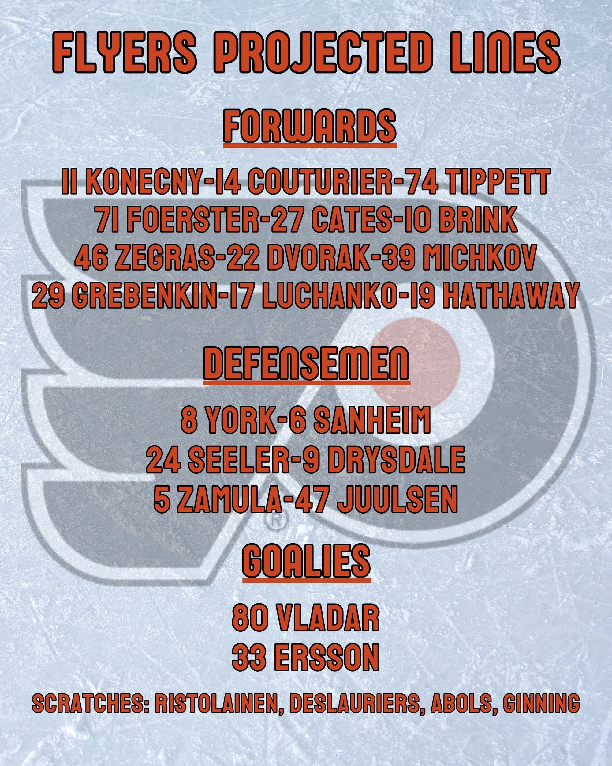 - Flyers: Nikita Grebenkin and Jett Luchanko are back in the lineup for Nick Deslauriers and Rodrigo Abols. There are no other changes to the lineup.